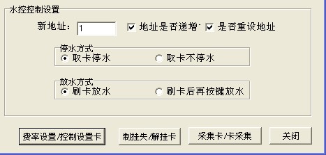2 水控控制設(shè)置:新地址設(shè)置為1,把地址號是否遞增和是否重設(shè)機器號前面的選項選上,如下圖所示,點擊費率設(shè)置|控制設(shè)置卡按鈕,點擊控制設(shè)置卡, 即可成功制作成控制設(shè)置卡去修改聯(lián)網(wǎng)型水控一體機的機器號??刂圃O(shè)置卡在機器上數(shù)卡成功時會提示8 OK 9 OK 10 OK