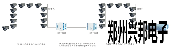 施工方采用485中繼器解決上述問題。在A,B教學(xué)樓里面各放一個485中繼器,等于把一個485網(wǎng)絡(luò)分成了3個485網(wǎng)絡(luò),這樣485網(wǎng)絡(luò)就可以很穩(wěn)定的運行。再由于教學(xué)樓之間的200m的距離是在兩個485中繼器中間,即使有強電干擾,由于485中繼器中防雷保護和光隔離功能,也會被其所吸收,隔離。從而保證了485網(wǎng)絡(luò)的穩(wěn)定性及安全性。