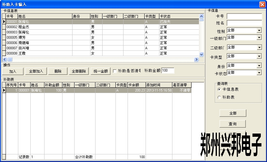 軟件中卡管理-補助入卡-補助入卡輸入中添加補助人員的名單,可以選擇是否清零,若選擇補助清零,在領取補助時會將卡上的金額先清零再補助上此次的金額;若選擇不清零,則在領取補助時會累加之前卡上的金額。