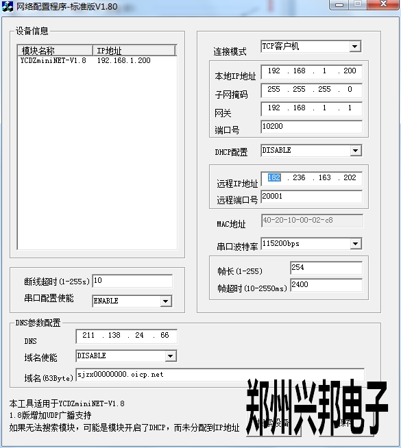 借鑒修改方法,取模塊IP地址的最后一空數字轉化為16進制數作為模塊MAC地址的最后一位。比如模塊IP地址為192.168.1.250我們就取200,變為16進制數為fa,那么該模塊就可以設置為40-20-10-00-02-fa