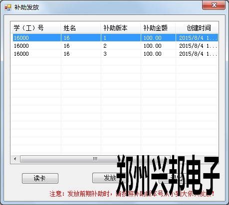 ?  首先點(diǎn)擊讀卡,讀卡后會(huì)按補(bǔ)助的版本號(hào)顯示出這張卡所有未領(lǐng)取的補(bǔ)助,領(lǐng)取過的不顯示,發(fā)放補(bǔ)助時(shí),按照補(bǔ)助的版本號(hào)從小到大依次發(fā)放,發(fā)放的時(shí)候選中要發(fā)放的補(bǔ)助,然后點(diǎn)擊發(fā)放即可。
