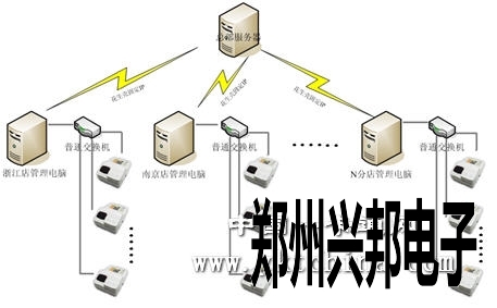 如上圖所示,整個系統(tǒng)的管理電腦單獨存在,在剛開始建設時就把各個分店的電腦數據庫單獨建立,制作卡片時,通過卡片的號碼段位來區(qū)分各店的范圍,只是在需要傳輸數據時,通過花生殼軟件等工具綁定IP地址,使各家分店和總部服務器之間的通訊無地理的局限,實現整個系統(tǒng)數據的實時交換。